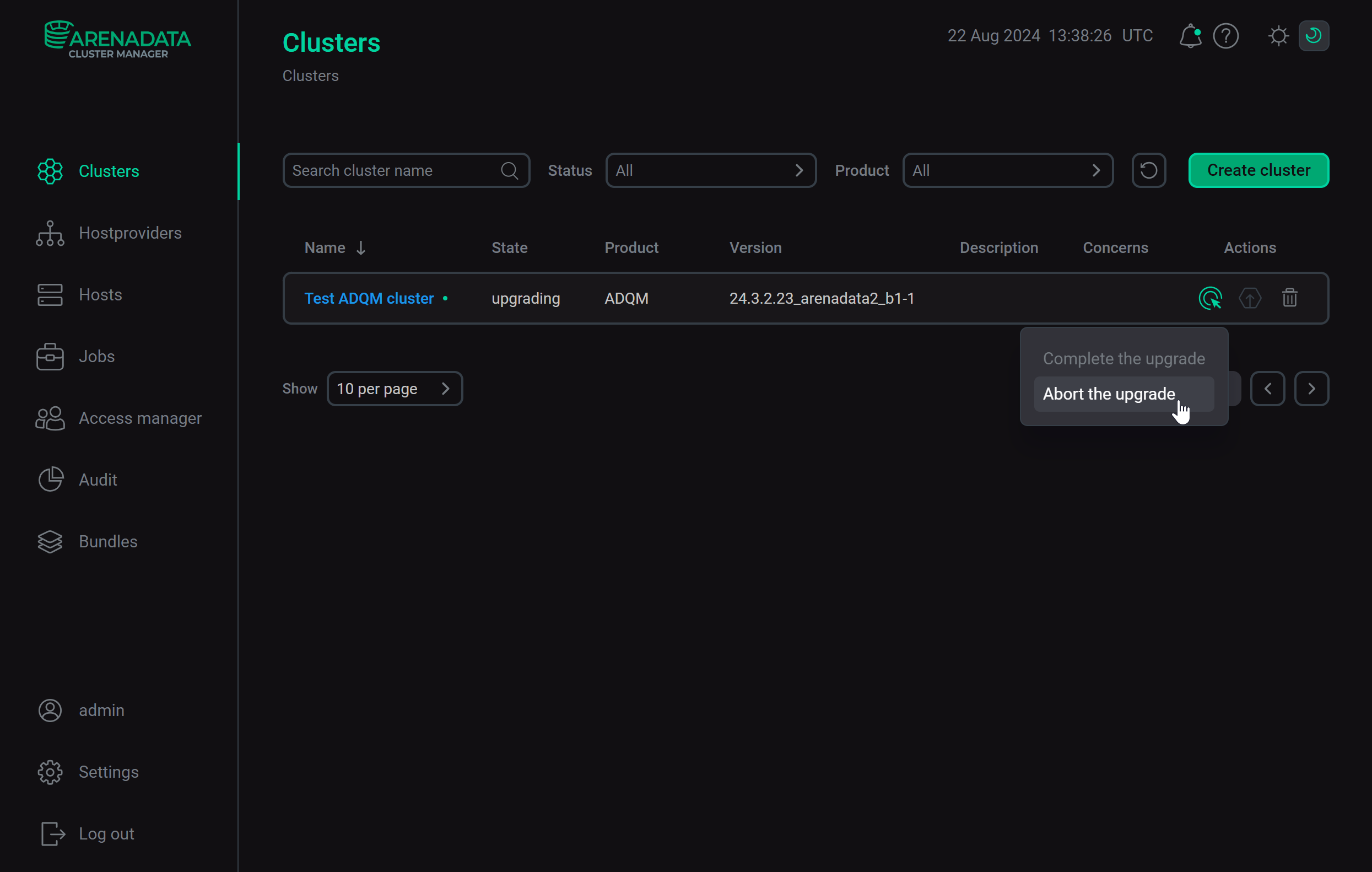 If you have detected any problems while testing the new version of ClickHouse, you can abort the cluster upgrade and roll back the previous version of the ADQMDB service on the previously upgraded hosts. To do this, switch to the Clusters page and run the Abort the upgrade action for the cluster.