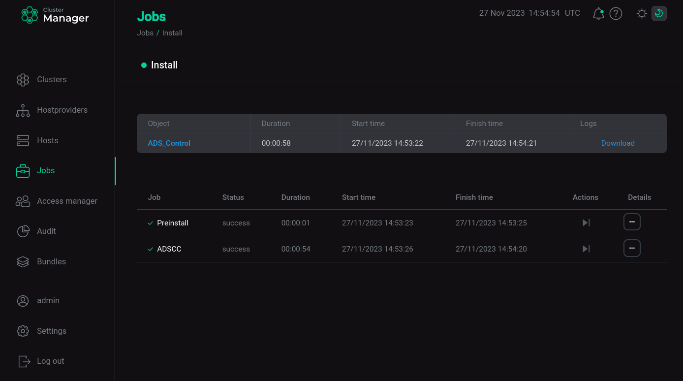 Download ADS Control bundle new version — see step Upload a cluster bundle to ADCM in the Create a cluster article.