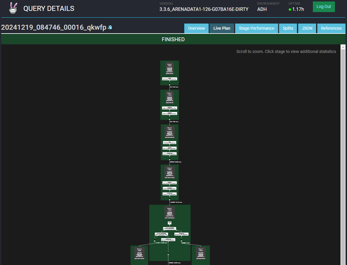 На вкладке Live plan расположена схема исполнения запроса по стадиям с подробной информацией о каждой стадии: статус выполнения, использование ресурсов, обработанные выражения и направление дальнейшей обработки запроса. Схему можно приближать и отдалять с помощью колеса мыши, а также двигать с помощью зажатой левой кнопки. Нажатие на одну из стадий в схеме откроет вкладку Stage performance, где будет выбрана эта стадия.
